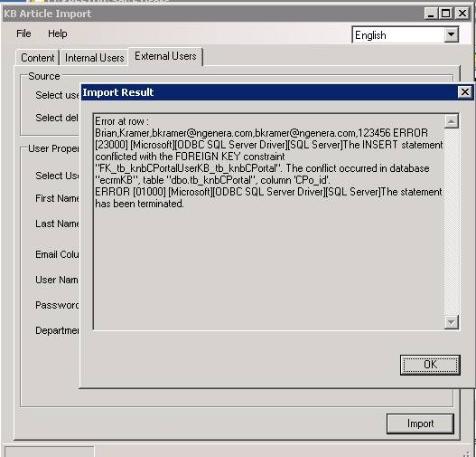 THIS ARTICLE APPLIES TO: Knowledgebase 8.1.1 through 8.3.2 HotFix 1 ISSUE DESCRIPTION: When importing External Users with the Bulk Import Utility, an error is encountered: ERROR [23000] [Microsoft][ODBC SQL Server Driver][SQL Server]INSERT...