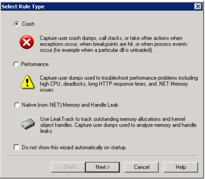 This article will server below - How to setup debugdiag. Verify recommended settings for debugdiag on the server Step 1 Open Debug Diag and click 'Add Rule...' Step 2 ensure that crash is selected and click 'Next >' Step 3...